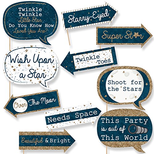 10-Piece Funny Twinkle Twinkle Little Star Photo Booth Props Kit INCLUDES 10 Moon and Stars arrow and speech bubble photo booth props, 10 wooden dowel sticks and adhesives for assembly. EASY ASSEMBLY: Simply attach the printed DIY photo booth props to the wooden dowels with included adhesive and reinforcing stickers.
