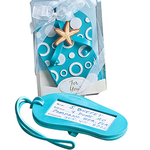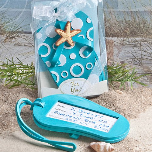 - The back of the flip flop has a clear plastic window-covered slot for the easy insertion of the included blank luggage tag once your guests' fill them out