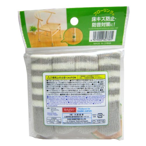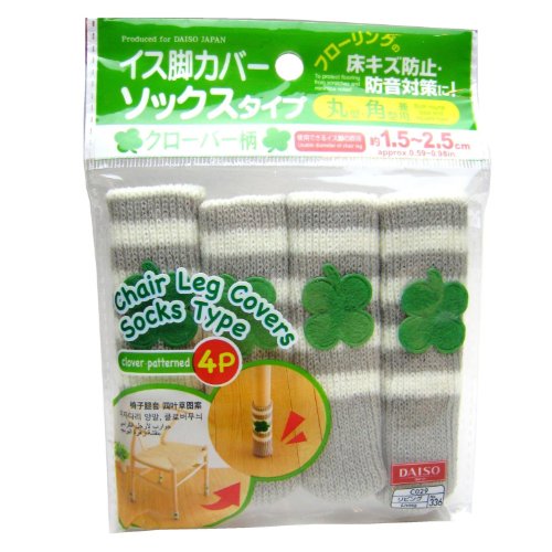 -. Color : gray -. EAN : 4979909847381 -. Feature : Protect hardwood flooring from scratches and minimize noise / Elastic fabric fits chair legs with diamater of 1.5cm to 2.5cm (0.59in to 0.98in) / Fits both round and square chair legs. Superior to felt pads. / Snug heavy-duty padding at the toe keeps socks on tightly / Green clover decoration easily removable if desired -. Label : DAISO INDUSTRIES JAPAN CO LTD -. Manufacturer : DAISO INDUSTRIES JAPAN CO LTD -. PackageQuantity : 4 -. ProductGroup : Home Improvement -. ProductTypeName : HARDWARE -. Publisher : DAISO INDUSTRIES JAPAN CO LTD -. Size : Standard Size -. Studio : DAISO INDUSTRIES JAPAN CO LTD -. Title : Chair Leg Cover Socks, Striped Gray Floor Protector Pads - Each Pack Contains 4 Pcs (enough for 1 chair)