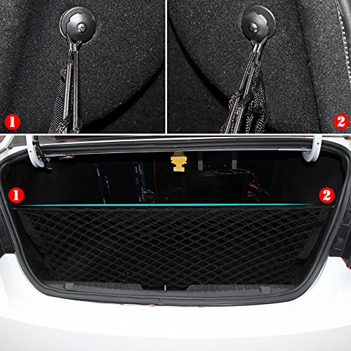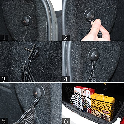 Envelope style elastic nylon netting. Fabric pockets for extra storage Easily attach to mounting points in the rear cargo area Net and all hardware is included (adhesive tape and heavy duty screw fasteners) How to install 1, Stick the mounting points with adhesive tape 2, Fasten it with screws Item included: Trunk Storage net *1 Hardware set *1