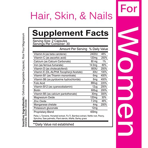WOMEN'S NEEDS! What Can Hair, Skin and Nails Multivitamin Do For Women? ♥ Toxic overload, stress, poor diet and the fast-paced lifestyle that most women are living today all contribute to lackluster skin, dry and brittle hair, and brittle nails that never seem to grow. This multivitamin boosts your natural collagen and keratin production to help provide supple skin, strong and silky hair, and strong, fast-growing nails.