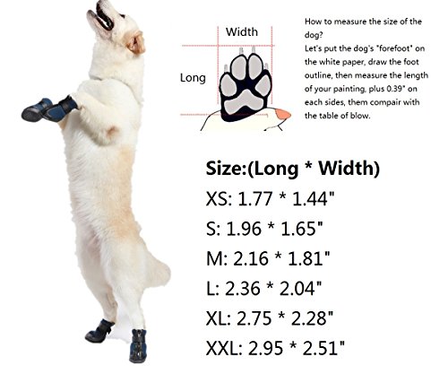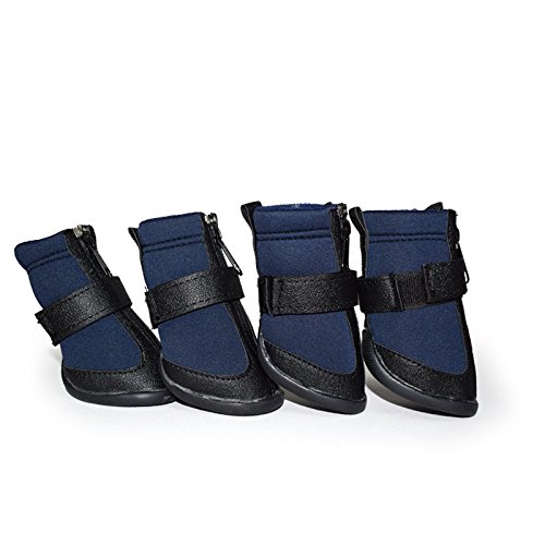 -. Feature : Suitable for most sizes of dogs. / Velcro design for easy wear and tear. / Applicable to pet walk out in snow, rainy days. / The elastic bandage has good elasticity, dog's leg joint is not restricted. / This Boots are made of professional diving fabric, with good waterproof effect, simple design and easy to wear.