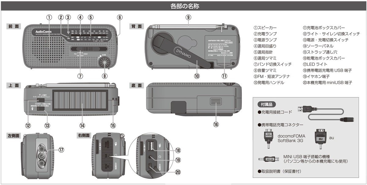 Tanbe "Radio NIKKEI" Reception Disaster Prevention Mobile Radio AM / FM / SW Hand-cranked Power Radio Light RAD-V963N ■ 4 Power Supplies (1) Charging Mobile Phones by Manual Hand Charging, Charging to this Machine.