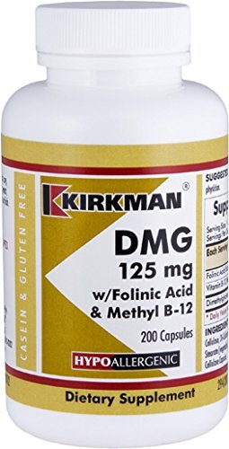 -. Binding : Health and Beauty -. Brand : Kirkman Labs -. EAN : 0812325021000 -. Feature : Supports methylation, methionine metabolism, folate chemistry and is an immune modulator. / DMG (Dimethylglycine) with Folinic Acid and B-12 hypoallergenic capsules / Our DMG is from DMG hydrochloride / formulated for individuals with special requirements and sensitivities -. IsAdultProduct : 0 -. Label : Kirkman Labs -. LegalDisclaimer : These statements have not been evaluated by the Food & Drug Administration. This product is not intended to diagnose, treat, cure or prevent any disease. -. Manufacturer : Kirkman Labs -. PackageQuantity : 1 -. ProductGroup : Health and Beauty -. ProductTypeName : HEALTH_PERSONAL_CARE -. Publisher : Kirkman Labs -. Size : 200 ct -. Studio : Kirkman Labs -. Title : DMG (Dimethylglycine) w/Folinic Acid & B12 Capsules - Hypo -. UPC : 812325021000