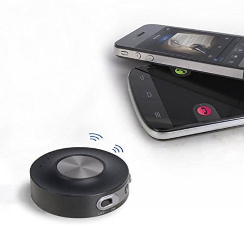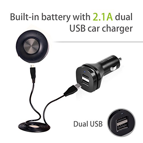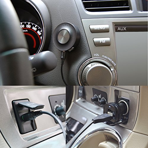 -. Feature : For safety and convenience when you're in the car, this Bluetooth handsfree car kit auto-connects with your smartphone when start to charge it (start your engine), and it then routes calls and music from your phone to the car's speakers (Require a 3.5mm AUX-In socket in your car). / Stay up to date with your car kit's status with voice prompts that alert you when your car kit is connected or running low on battery. (With Pairing, Your phone is connected and Battery low voice prompts) / The multi-point support of this Bluetooth aux adapter allows you to connect 2 devices simultaneously. The car kit also comes with a 2.1A dual USB car charger and is compatible with iPhones(iPhone 6 and iPhone 6 plus), iPads, HTC, Samsung devices, and more. / Enjoy music with CD-quality sound, thanks to the aptX decoder. And, the 3.5 audio output and micro USB charging port enables you to use your own audio and universal micro USB cable. / This portable Bluetooth car speakerphone's magnetic base allows you to easily detach it from the controller, and with 26 days of standby time and 10 hours of talk time, you can enjoy using your handsfree car kit even on long journeys.