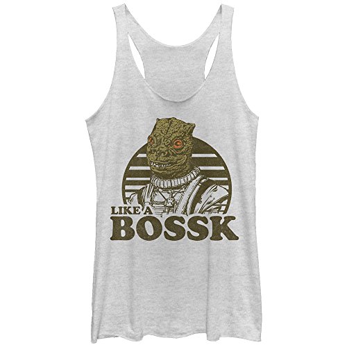 Studio : Fifth Sun Publisher : Fifth Sun Binding : Apparel Product Description Chewbacca better watch out because the infamous Wookie hunter, Bossk, is here to wreak havoc with the Star Wars Like a Bossk Heather White Racerback Tank Top. One of Bobba Fett's mentors, Bossk, is portrayed with the phrase "Like A Bossk" across this light gray Bossk tank top for a fun twist on the Bounty Hunter. 50% Polyester, 25% Cotton, 25% Rayon. 0