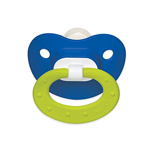 -. Binding : Baby Product -. Brand : NUK -. Color : Blue/Blue -. EAN : 0713331131298 -. Feature : Juicy Pacifiers with classic puller and bright vivid colors with no design / Features our improved nipple that soothes and calms baby better than our original nipple and an asymmetrical shape that helps promote healthy oral development by naturally fitting into your baby's palate / Scoop nipple cavity allows maximum tongue movement, which gently exercises your baby's tongue, palate and jaw and promotes proper teeth alignment by helping your baby avoid thumb-sucking / Heart shaped shield fits perfectly under baby's nose for easy breathing and less irritation / BPA free with silicone orthodontic nipple and made in the USA -. Label : NUK -. Manufacturer : NUK -. PackageQuantity : 2 -. ProductGroup : Baby Product -. ProductTypeName : BABY_PRODUCT -. Publisher : NUK -. Size : Size 2 -. Studio : NUK -. Title : NUK Juicy Puller Silicone Pacifier in Blue/Blue, 6-18 Months -. UPC : 713331131298