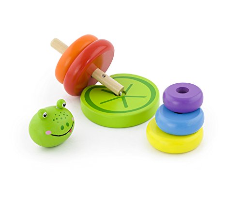 This wooden ring stacker toy with adorable frog design puts a new spin on a timeless toy. This frog stacker is a wonderful toy for developing your child's motor skills, as well as teaching him or her about colors and sizes. Set includes 5 colorful wooden rings, 1 wooden lotus leaf base, 1 cute wooden frog head and 1 natural wooden pole. The colorful wooden rings with holes in the center are well sized and easy for little hands to grasp, move and stack. Size: 3.94 x 7.1 inches. Ages 2+Feature