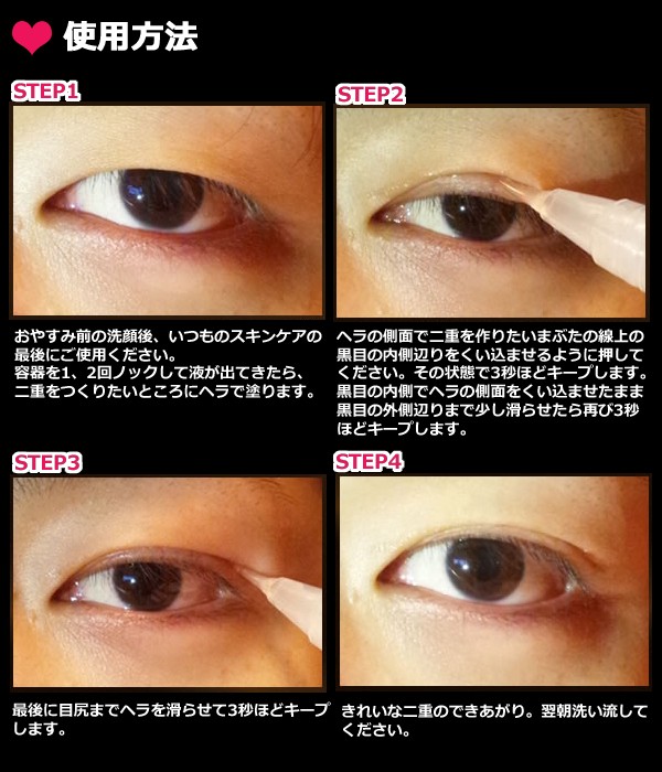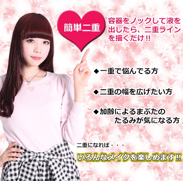 寝ている間に二重にクセづけできる美容液です。コラーゲン、ヒアルロン酸、3Dヒアルロン酸、サンフラワーセラミド、デレセリアサングイネアエキスなど、美容成分配合でお肌に負担をかけず、保湿し引き締めます。