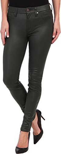 The Skinny features a comfortable low rise and skinny leg that hits at the ankle. Low rise features a contoured waistband to prevent gapping. Seamed detail lends an articulated knee. This forest green coating that has been given a special laser processing to create a crackled, faux-leather finish. Sueded Knit 10 oz fabric boasts a soft, supple feel and high degree of stretch for a resilient, lasting fit. Gold-tone hardware. Woven brand labels at the back waist and pocket. Five-pocket construction. Belt loop waistband. Zipper fly and button closure. 90% polyester, 10% spandex. Hand wash and hang dry. Made in the U.S.A. of imported fabric and components.
