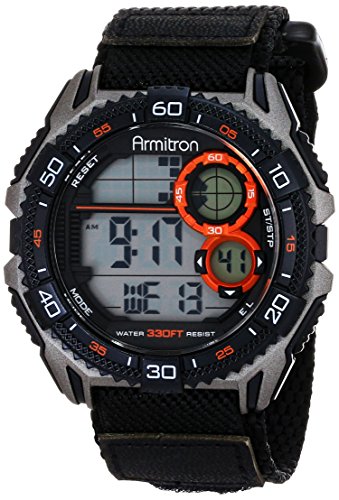 Sport watch with black resin case featuring LCD display and chronograph with lap time, military time, and alarm