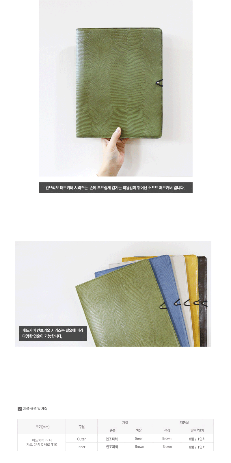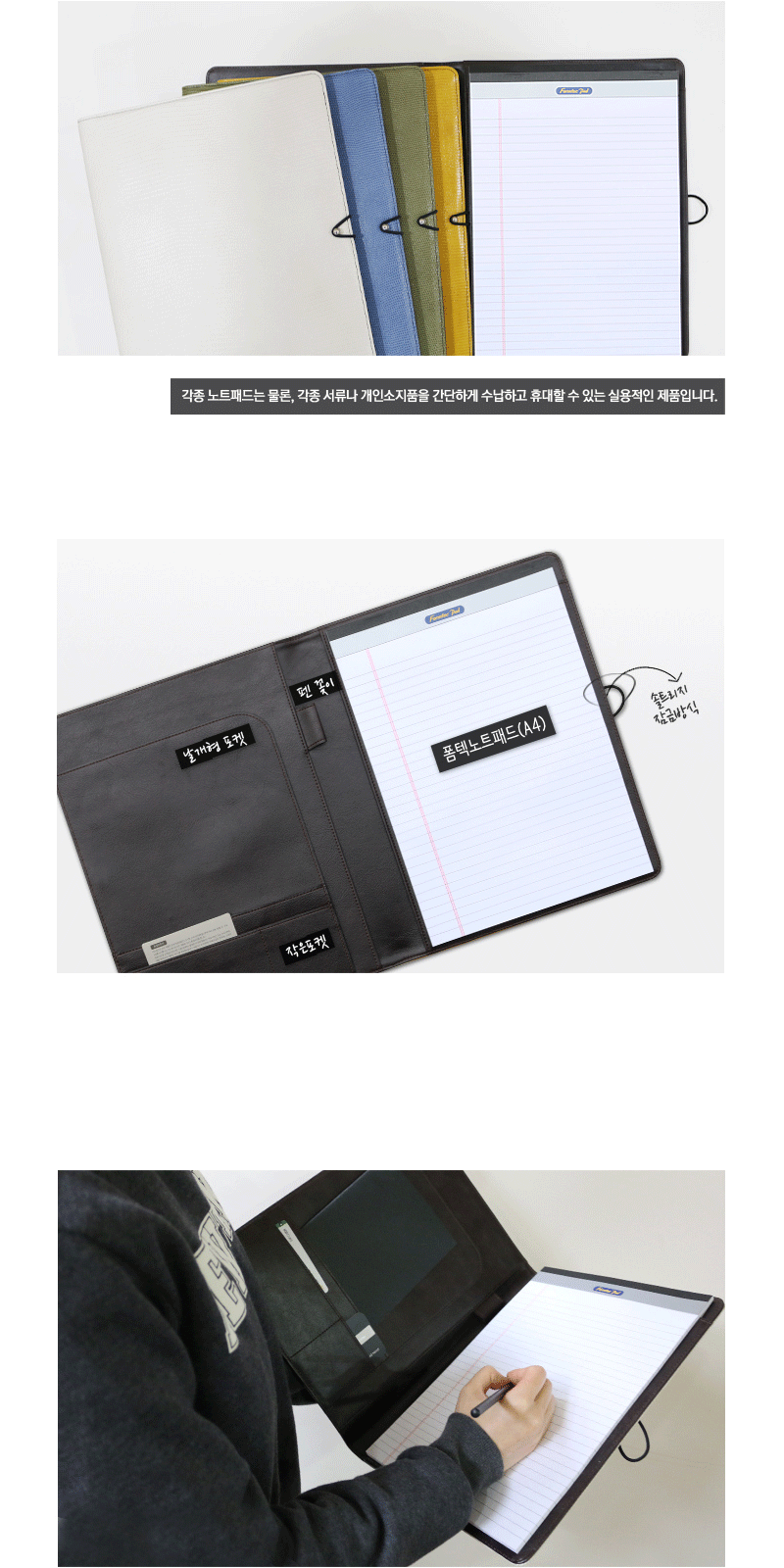 내구성이 뛰어난 장점을 가진 제품으로 노트패드(A4)는 물론, 각종 서류나 개인 소지품을 간편하게 수납하고 휴대할 수 있는 실용적인 제품입니다.