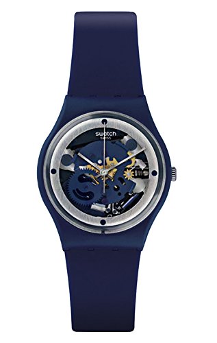 Navy blue plastic case with a navy blue silicone strap. Fixed silver-tone bezel. Blue skeleton dial with silver-tone hands. Dial Type: Analog. Quartz movement. Scratch resistant plexiglass crystal. Pull / push crown. Solid case back. Case diameter: 34 mm. Case thickness: 8.75 mm. Round case shape. Band width: 25 mm. Tang clasp. Water resistant at 30 meters / 100 feet. Functions: hour, minute, second. Casual watch style. Swatch Squelette Blue Skeleton Dial Ladies Watch GN245.Feature