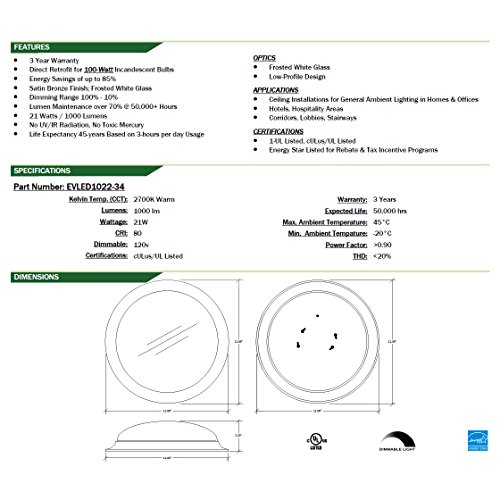 Envirolite low profile ceiling light fixtures are designed to enhance any decor and with a clean, fresh appearance. This modern LED ceiling light fixture easily mounts flush with the ceiling, and the low profile design keeps it out of the way of closet doors. The protective satin bronze finish will look great for years to come, and the frosted white lens diffuses the LED light evenly. You won't see any Dark spots or shadows. This ceiling light features a twist lock design. This flush mount uses a LED powered lighting engine instead of lamps to produce higher quality light for a fraction of the electricity, saving you money off your utility bill. This light fixture produces 1000 lumens (about the equivalent of a 100-watt light bulb) using only 21-watt. The LED lighting source is made to last for 50,000 hours or 45 years at 3 hours per day; there are no bulbs to replace -ever. This ceiling fixture is energy star listed.Feature