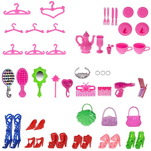 Package Including:Total 50pcs -9 Pack Barbie Doll Clothes Party Gown Outfits (Color Random )+41pcs Different Barbie Accessories Shoes bags Glasses Necklace Tableware Mirror For for Barbie doll Girl Birthday Gift ( Not Contain Doll)