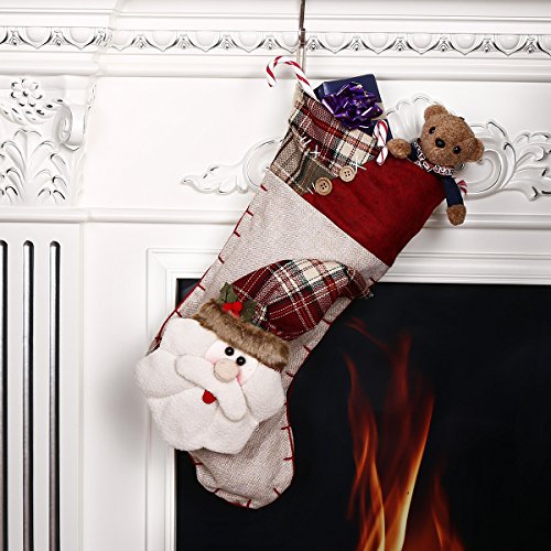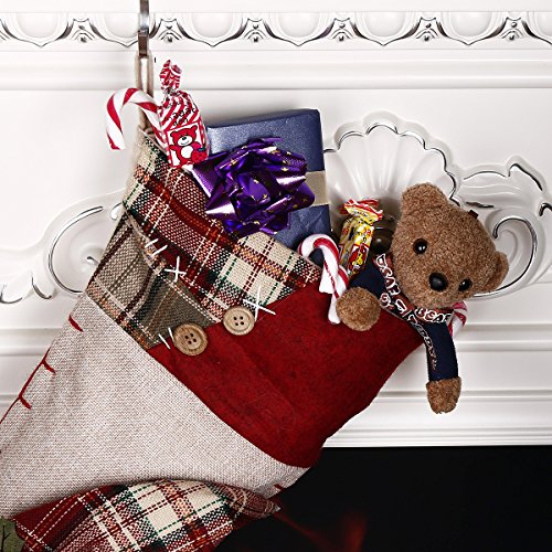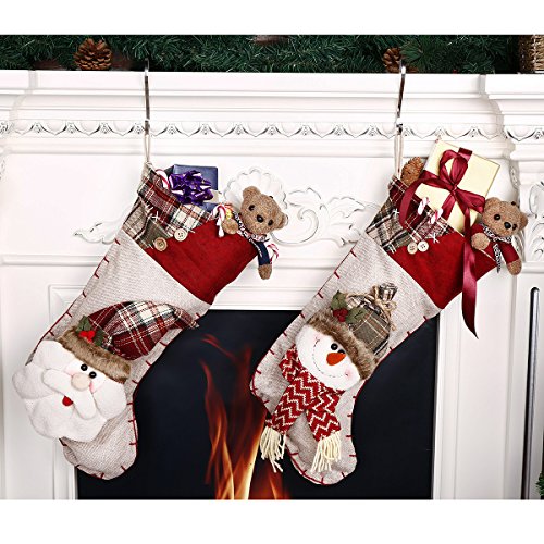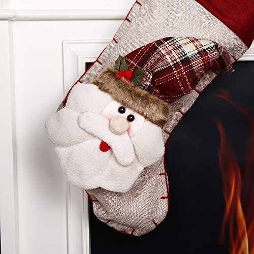 - ► This holiday stocking using classic burlap and patchwork plaid trim, to give it a little Christmas holiday atmosphere, we added a 3D snowman with exquisite detailing like knitted woolen scarf, lucky mistletoe, furry and plaid hat. Colors in red, green and white that make it to match all your Christmas decor.