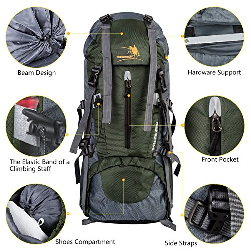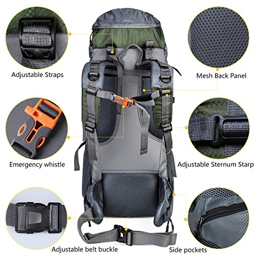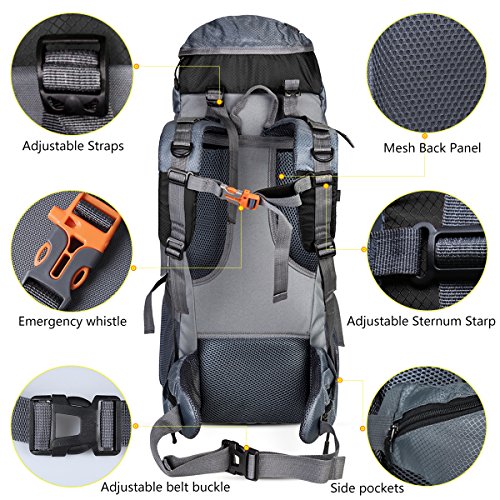 -. Feature : [60+5L CAPACIYT] : Just right for youth and adults for light backpacking trips, best for 2-4 day adventures, The top external cover can additional space up to 5L, the overall capacity of 60+5L capacity; weighs 2.8 pounds (1.3 kg). / [RESCUE WHISTLE] : The top drawstring design, adjustment shoulder belt button and the sternum strap with emergency whistle buckle design are practical. / [WATERPROOF NYLON & PU] : Made of high-density, abrasion, water resistant and anti-scratch nylon fabric, withstand the bad weather with the maximum durability. The surface layer of PU fabric is super anti-skid and waterproof. / [COMFORTABLE] : Adjustable sternum straps and waist ,chest strap to meet different requirements for both men & women. Waist strap distribute and transferring much of the weight to hips and legs. / [OCCASION] : Perfect for hiking, occasional travel, day-to-day use, pack beach accessories, suitcase alternative, college, camera compartment, camping, day trips, vacation, travel, school and shopping and more, and great gift for everyone.