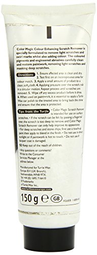 -. Brand : Turtle Wax -. Feature : Turtle Wax Colour Magic Plus: proP.R.Ietary color match system is formulated specifically for rejuvenating and enhancing the color of car finish. / Simple to Use: Polyurethane enriched formula: Leaves a deep, brilliant shine and provides long lasting protection. Rejuvenates older, faded finishes that have been neglected / Professional Finish: Suitable for metallic and clear coats. Helps restore and repair a car's finish. / Polishes out light scratches and swirl marks. / lasts up to 25 washes. -. IsAutographed : 0 -. IsMemorabilia : 0 -. Label : Turtle Wax -. Manufacturer : Turtle Wax -. Model : FG -. MPN : FG -. PackageQuantity : 1 -. PartNumber : FG -. ProductGroup : Automotive Parts and Accessories -. ProductTypeName : AUTO_ACCESSORY -. Publisher : Turtle Wax -. Studio : Turtle Wax -. Title : Turtle Wax Color Magic Car Polish Cleans Shines Restores Scratches Remover 150 g Tube