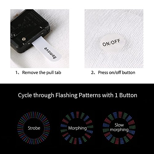 3 Flashing Modes 3 flashing modes: 3 color strobe, 3 color morphing, 3 color slow morphing. Our hat may help you live brighter! You can cycles through 3 light modes by a button.
