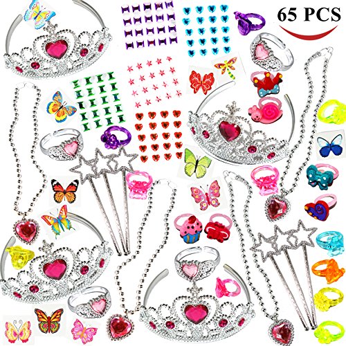Super Value High Quality Collection of 65 Pieces Best Selling Toy&Accessories Assortments for Girls is a perfect gift as party goodie bags, party favors, and party giveaways.Parents can use it as rewards gifts. It includes every accessory for a halloween princess costume. Girls love to play with them in a pretend Tea Party and keep them in a treasure box. This toy set has a wide collection of many best selling girls toys:6 pieces 6" Mini Star Wands and 4 Princess Tiaras
