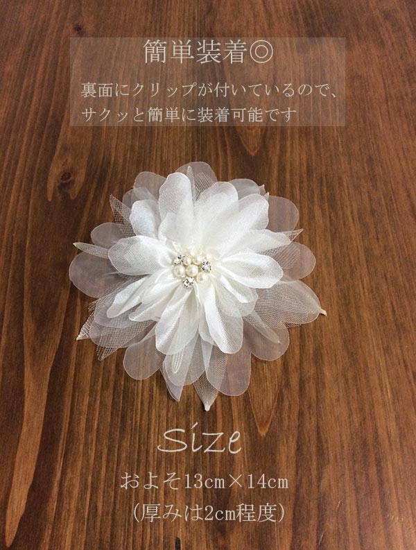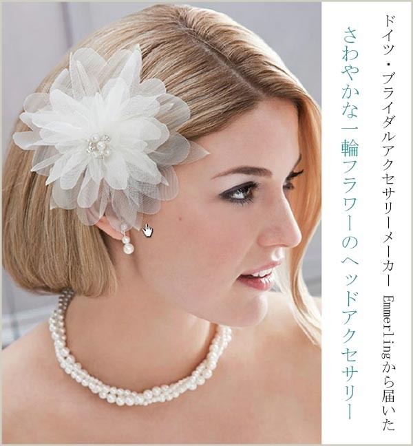 ” あなたらしいコーディネートに、きっと思い出の品として残ります。 ”ウエディングにぜひ、ポイント使いにおすすめヘアアクセサリーです!(ヘッドドレス)オーガンジーとチュールで仕上げられた一輪フラワーのヘッドアクセサリー。ドイツエマーリング社からの輸入商品です。幾重にも重なる花びらとアクセントに施されたパールとクリスタルストーンがすっきり爽やかな印象を与えてくれます。アップスタイルにもダウンスタイルにも、ヘアスタイルのポイントとして華やかに彩ってくれます。【検索キーワード】ウェディングドレス/ウエディングドレス/白ドレス/マリッジ/ブライダル/ガーデンウェディング/フォトウエディング/花嫁/新婦/ブライズ/挙式/結婚式/披露宴/パーティ/パーティー/チャペル/教会/人前式/セレモニー/海外/リゾート/ホテル/式場/2次会/1.5次会/前撮り/アクセサリー/ヘアアクセ/ウエディング小物/ウェディング小物/Wedding/Bridal/ギフト/プレゼント/贈り物/花/フラワー