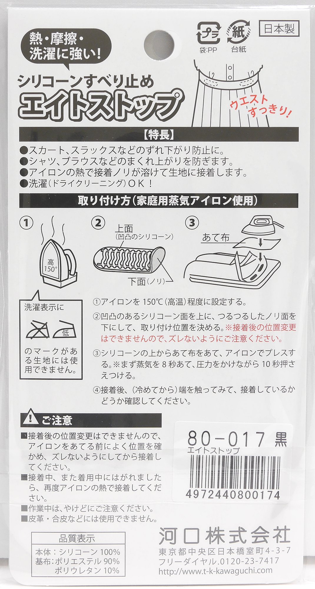 It is attached to the inside of the waist part, and it is an excellent thing that can prevent skirt · slacks slippage and shirts · blouses roll up.