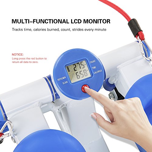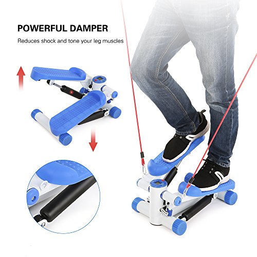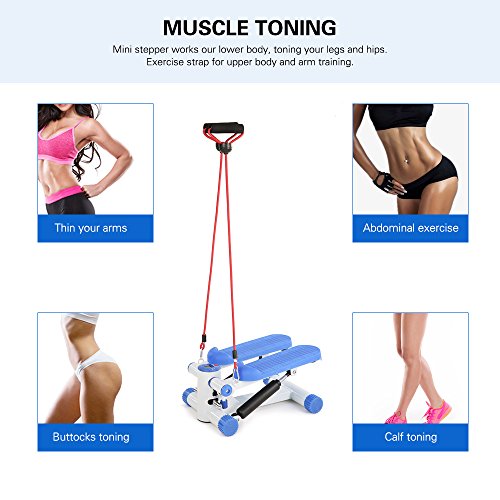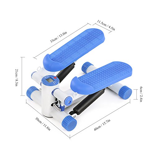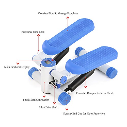 Studio : TOMSHOO Publisher : TOMSHOO Binding : Misc. Product Description This mini stepper is equipped with a LCD monitor which includes multiple functions: scan, time, calories, count, strides/min. It is very easy to use, just stand up and twist up and down for buttock and thigh workout. The included resistance bands are used to train your upper body, so this mini stepper can fulfill a full-body workout. The heavy-duty steel construction with large nonslip pedals and rubber feet caps make the stepper extremely reliable and stable. It is lightweight and compact, perfect for home and office use.