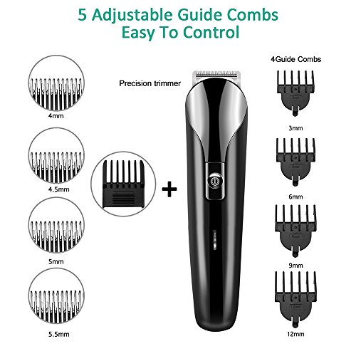 ☑5 Adjustable Guide Combs: One precision trimmer positioning comb and three individual blade guards(3/6/9/12mm) let you maintain an even length. A green hand will be easy to control.