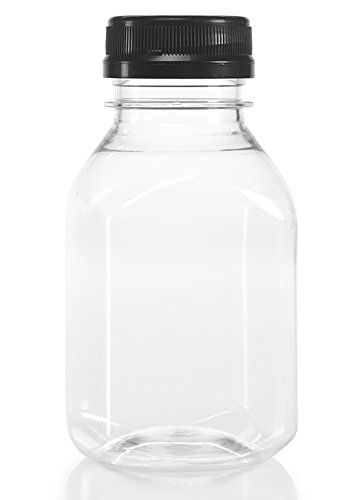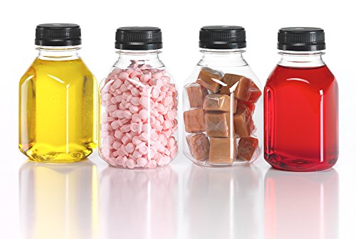 8 Oz. Clear Juice bottles with SILGAN Brand, 38mm Plasti-twist caps. Caps are lined to help seal in your product's freshness and have drop down safety Bands for improved tamper evidence. Sturdy 23 gram bottle weight. Package of 6 bottles with lids