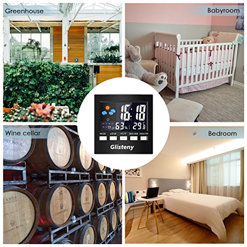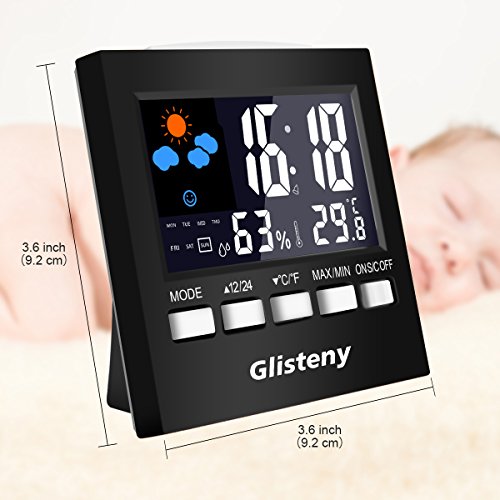 Studio : Glisteny Co.,Ltd Publisher : Glisteny Co.,Ltd Binding : Kitchen Product Description Color:Black GLISTENY Temperature and Humidity Monitor This all-in-one thermometer hygrometer, timer and alarm clock can provide you reliable humidity / temperature / time readings so that you can regulate your household for maximum comfort. Please read the included user manual carefully and thoroughly before use and keep it appropriately for future use. Features: 1.LCD Screen with Large Numbers: LCD screen display with large numbers makes it really easy to read; Low battery indicator. 2.Portable and Tabletop Design: The small and portable humidity monitor allows you to move the device from location to location. 3.Displays the Temperature Humidity Calendar Clock: With Fahrenheit and Celsius temperature switch function. There are two displays of Fahrenheit and Celsius. It also shows the accurate humidity. What's more, display hour, minute, date, month, week and 12/24 hour system. 4.Alarm Clock with snooze function: Alarm Clock can reminder warmly that you won't forget anything. 5.Backlight Function: Button-control Sound-control. The blue backlight is bright and makes the screen easy to read in low light when activated, and automatically turns off after 8 seconds. 6.Good packing ensures the unit against any possible damage during transit. Specifications: 1.Temperature Range: 30¡aF ~ 122¡aF (0¡aC ~ 50¡aC). 2.Humidity Range: 20% ~ 99% RH. 3.Frequency of Readings: 8 seconds 4.Material: Plastic 5.Dimension: 3.6 x 3.6 x 1.6 inches 6.Weight: 4.2 ounce 7.Power Supply: 2 x AAA 1.5V Battery (Not included) Package Includes: 1 x GLISTENY Temperature and Humidity Monitor 1 x User Manual