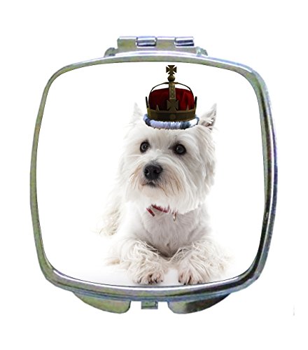 White Yorkie Puppy Dog Wearing a Crown - Compact Mirror in Silvertone - Square Shaped - Pocket Sized