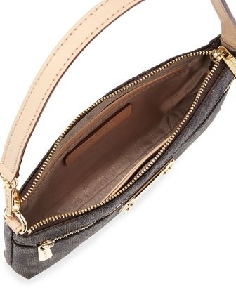 - Feature : Made of brown logo-print signature PVC. / Approx. 8" x 5" x 1". Approx. 12" wristlet strap with dog leash clip; can be worn as shoulder strap. / Zip top closure with logo pull. / Exterior zip pocket; Interior multifunction slip pocket; 4 credit card slots. / Signature fabric lining. Gold tone hardware.