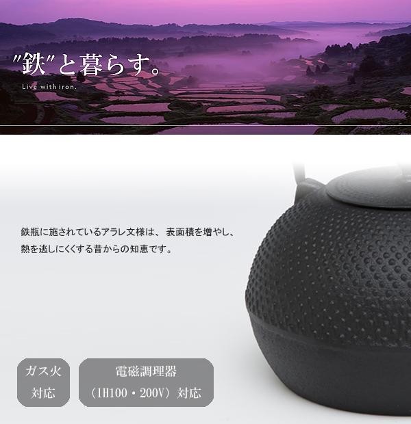 鉄瓶に施されているアラレ文様は、表面積を増やし、熱を逃しにくくする昔からの知恵です。またお湯を沸かすと微量の鉄分が溶出し、不足しがちな鉄分を無理なく摂取できます。 |