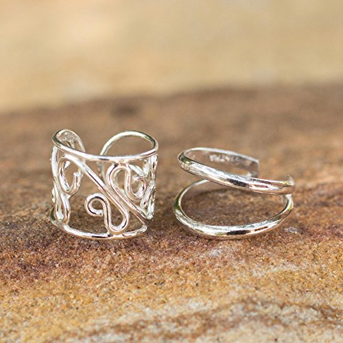 About this item: From Wadarat Supasirisuk, these .925 sterling silver ear cuff earrings contrast minimalism with filigree-like lace. The sterling silver pair slips on to the ear and can be worn together or separately. One earring features two sleek and simple bands that connect at the ends; the other earring features ribbon-like strands of silver in curled patterns. Each modern cuff-style earring features a polished finish.