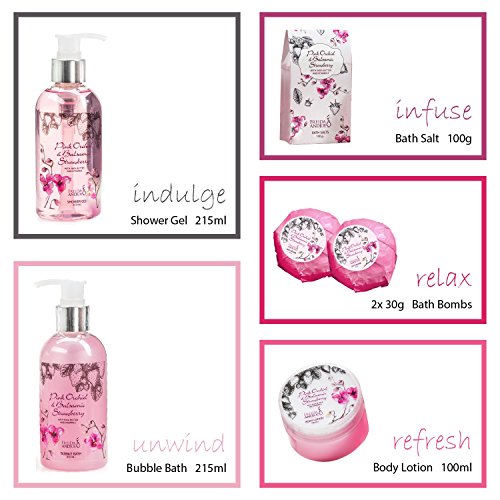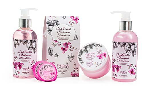 Luxury Aromatherapy Essentials Pink Orchid Balsamic Strawberry Spa Gift Set for Women: Bath Bombs, Body Lotion, Bath Salts, Shower Gel, and Bubble Bath