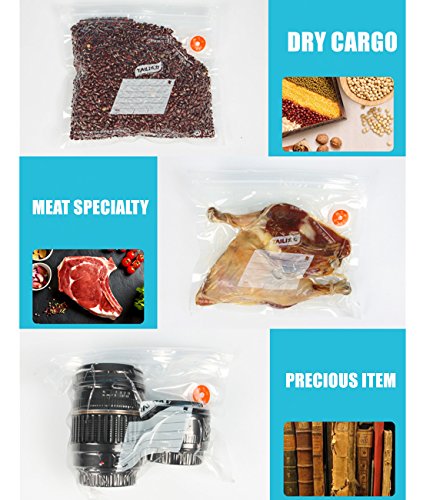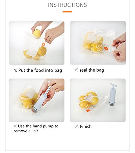 EASY TO USE -- To seal your food, simply click the valve on to any bag. Seal the bag by locking a seal across the top. Then, attach the pump to the valve, and use the manual pump to vacuum out the air. The bag is now vacuum sealed and the food within will be better preserved.