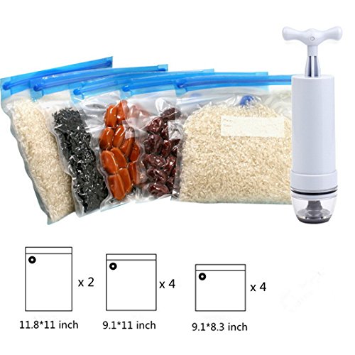 Fecihor Vacuum Sealer with Hand Pump -Food Sealer Valve System -Sous Vide Bags Keep Food Saver Longer-Reusable Storage Bags Sealed-10 BPA Free Vacuum Sealer Bags (3 Sizes), 1 Hand Pump