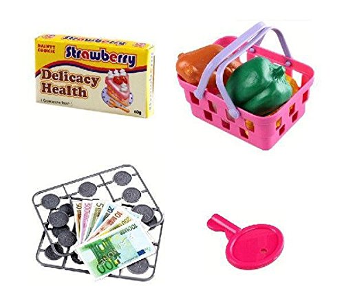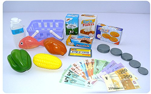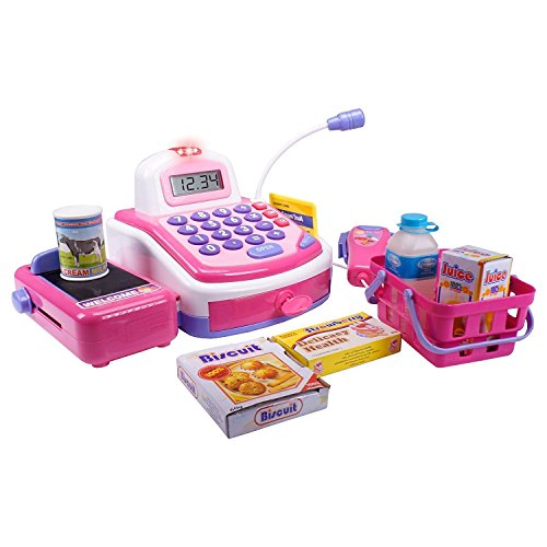 TOY CASH REGISTER INCLUDES:microphone,credit card scanner,play money,play groceries,basket, calculator