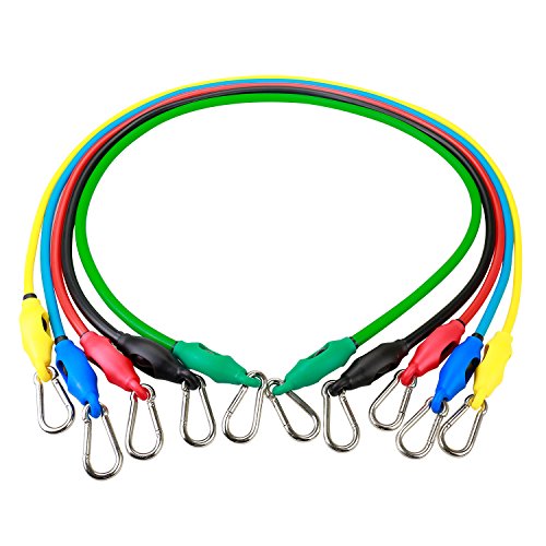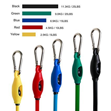 Five color-coded professional gym quality natural latex tube bands can be used alone or stacked in any combination up to a maximum equivalent of 75 lbs.