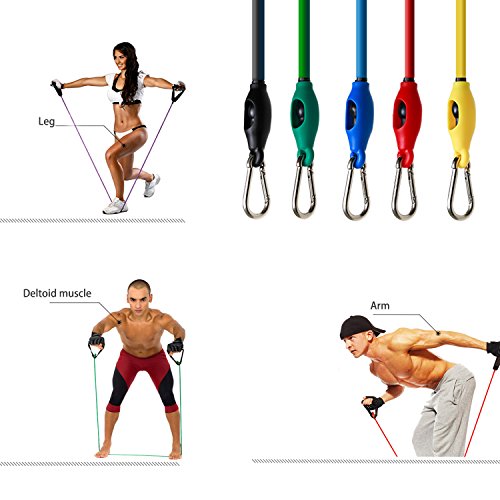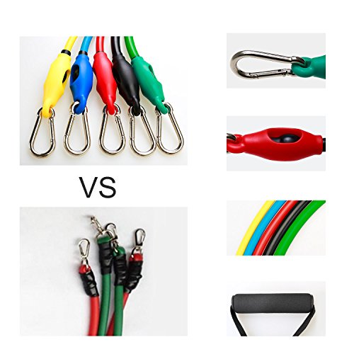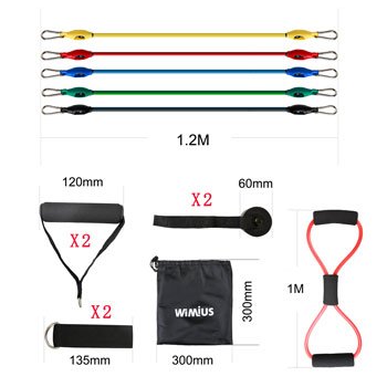 1 x Yellow resistace band-5LBS, 8*1200mm(Diameter*Length) 1 x Red resistace band-10LBS, 9*1200mm 1 x Blue resistace band-15LBS, 9.5*1200mm 1 x Green resistace band-20LBS, 11*1200mm 1 x Black resistace band-25LBS, 11*1200mm 1 x 8 shape resistance band: 9*1000mm 2 x foam handle 2x ankle strap 2 x door anchor 1 x waterproof carrying bag AND we offer 12-month warranty and 30-day money back guarantee.