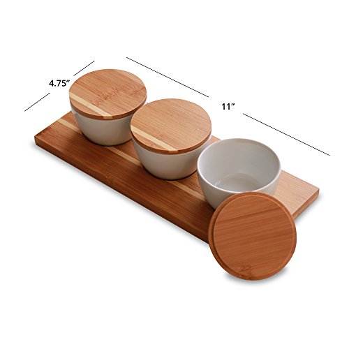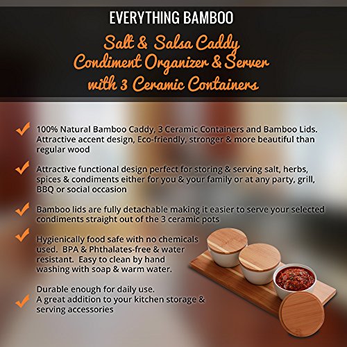 Studio : Q Technologies Publisher : Q Technologies Product Description 100% Natural bamboo caddy ceramic container with lids and attractive accent design. Eco-friendly, stronger more beautiful than regular wood. The attractive functional design is perfect for storing serving salt, herbs, spices condiments either for you and your family or at any party, grill, BBQ or social occasion. Bamboo lids are fully detachable making it easier to serve your selected condiments straight out of the 3 ceramic pots. Hygienic food safe bamboo white ceramic containers with no chemicals used. BPA Phthalates free, water resistant easy to clean by hand washing with soap and warm water Durable enough for daily use, a great addition to your kitchen storage serving accessories. 0