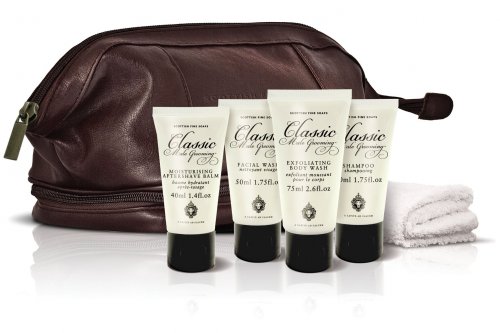 - A Luxurious Gentleman's travel bag this is the perfect Wash Bag for any male. Containing 75ml Exfoliating Body wash 50ml Facial Wash 50ml Shampoo and 40ml Moisturising Aftershave Balm.