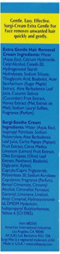 Surgi-Cream Extra Gentle for Face is a quick, effective and gentle way to remove facial hair from upper lip, cheeks and chin. Smooth on Cream Hair Remover, relax for a few minutes and rinse away. Product works in as little as 4 minutes. Extra gentle formula now features Maple Honey, known for helping skin retain moisture. With Surgi-Cream, the hair removal process is even more kind and gentle on the delicate skin of your face. As our bonus to you, we have included a Free tube of Surgi-Soothe Cream with Hair Stop Plus TM. Hair Stop Plus TM contains extracts of papaya, citrus and olive to naturally minimize the appearance of new hair growth. Pro-Vitamin B2 and Aloe Vera calm, soothe and moisturize.Feature