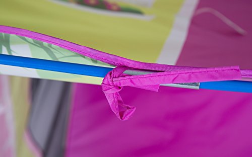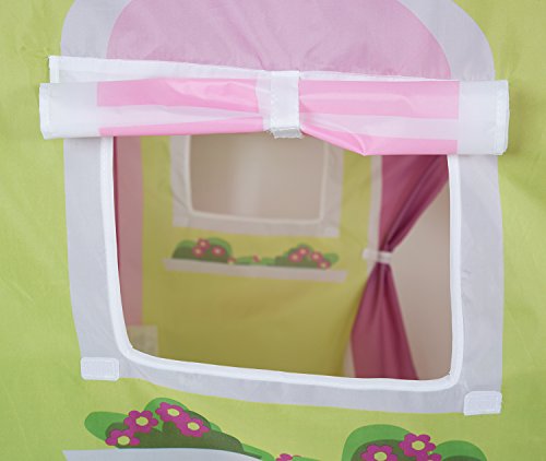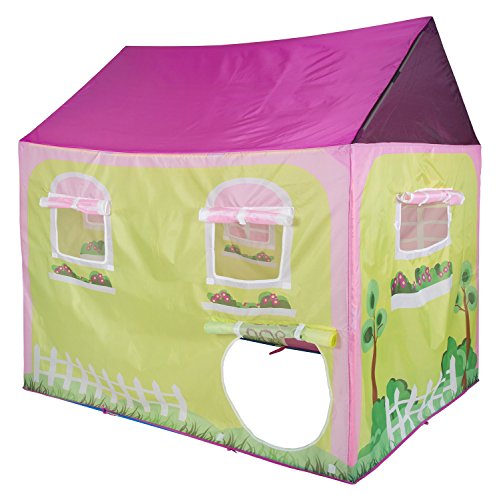 The Cottage Play House Tent from Pacific Play Tents is filled with fun features including full curtain front doors and a mesh sky light. Soft colors combine with beautiful landscape to help create the most imaginative play environment around. View the outdoors through the see-through mesh windows, and get ready for hours of exciting playtime. Sturdy polyurethane-coated shock-corded poles are color coded for easy assembly. Tunnel ports feature rollup flaps. Easily cleaned with a damp cloth and mild soap. Carry bag included.Feature