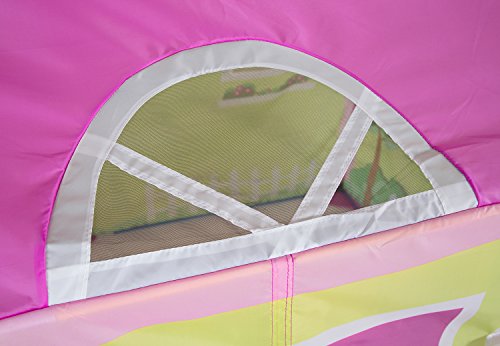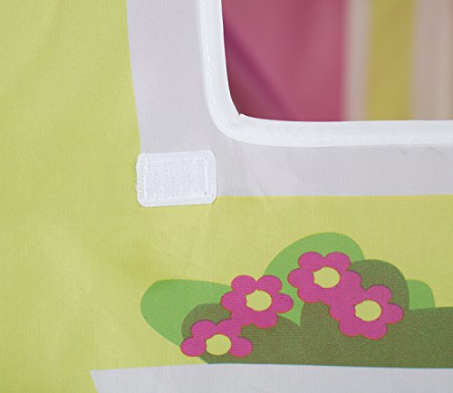 Tent size: 58" X 48" X 58" high, Cute cottage house graphics, Mesh top-panels and windows, and a tunnel port with roll-up flaps