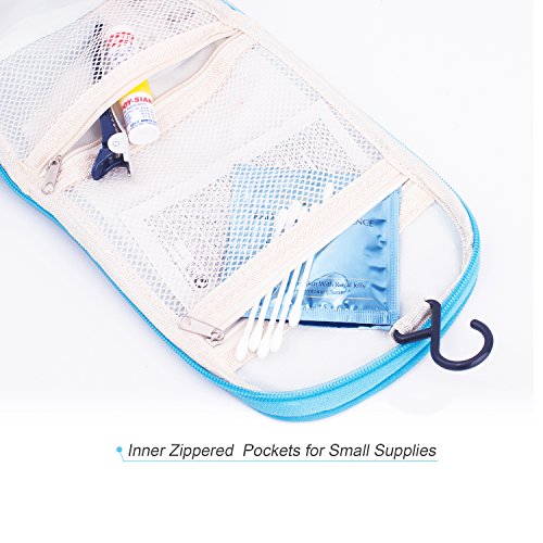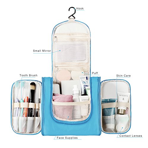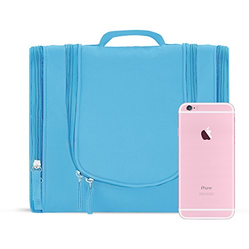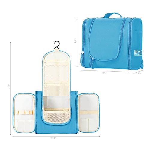 Zodaca Large Portable Makeup Hanging Toiletry Bag, Cosmetic Bag Case Travel Kit Organizer with Hanging Hook & Multi Compartments For Household/ Family Business Trip/ Road Trip/ Vacation, Light Blue