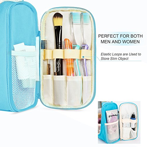 - EXTRA COMPARTMENTS: 1 main compartment for storing large-size supplies: lotions, sunscreen, perfume, shampoo. 2 inner zippered mesh pockets for storing small supplies: tweezers, cotton pads, contact lens, lens case. 8 inner pockets for storing different size of toiletry, wash supplies, shower essentials etc. 2 sided zippered compartment for storing slim objects: makeup brush, toothbrush and razor. The right exterior pocket provides a perfect storage place for grab-and-go items.