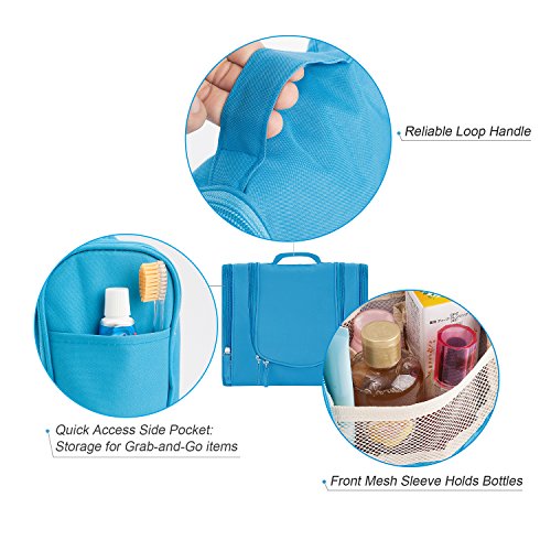 - SMART HANGING HOOK: The attached hanging hook allows you to hang the toiletry bag on towel racks, clothes hooks or suction cups. With the front mesh sleeve, no worries about items falling out while hanging.