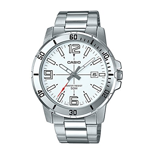 Brand, Seller, or Collection Name:Casio Model number:MTP-VD01D-7BVUDF (A1365) Part Number:MTP-VD01D-7BVUDF (A1365) Item Shape:Round Dial window material type:Mineral Display Type:Analog Clasp:Fold-over-clasp Case material:Stainless steel Case diameter:45 millimeters Case Thickness:10.5 millimeters Band Material:Stainless Steel Band width:18 millimeters Band Color:Silver Dial color:White Bezel material:Stainless steel Bezel function:Fixed Calendar:Date Special features:n/a Item weight:4.16 Ounces Movement:Japanese quartz Water resistant depth:50 Meters