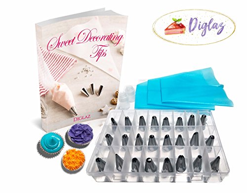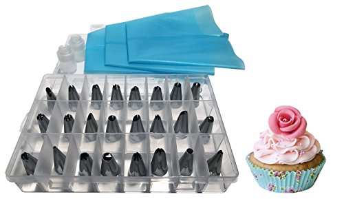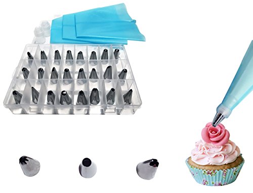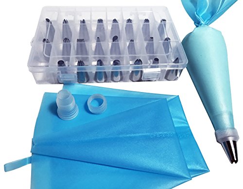 Cake Decorating tips set with 3 FREE Reusable silicone icing bag. 27 Piece Baking Tools Supply and Storage Case. Professional Stainless Steel Piping/Dispenser Nozzle Kit.